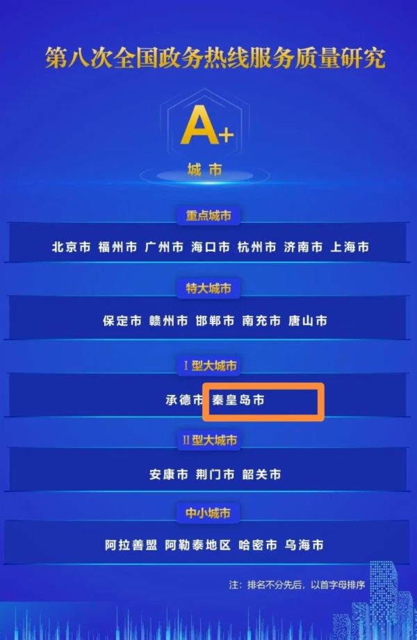 2026年1月30日,中山大学数字治理研究中心、新华数字政府研究中心发布《第八次全国政务服务热线质量研究报告》,秦皇岛市热线服务质量为最高等级“A+”,标志着我市12345热线服务在标准化、智能化、高效化方面持续走在全国前列。此次研究围绕热线“管用”“好用”构建多维指标体系,包含目标实现和过程体验2个一级指标和21个末级指标,以“无感测评”方式采集全国333个城市数据,针对不同城市体量规模划分5种类别(重点城市、特大城市、I型大城市、II型大城市,中小城市),热线服务质量等级获A+的共21个。秦皇岛入选“I型大城市”热线服务质量等级“A+”,全国仅2个。